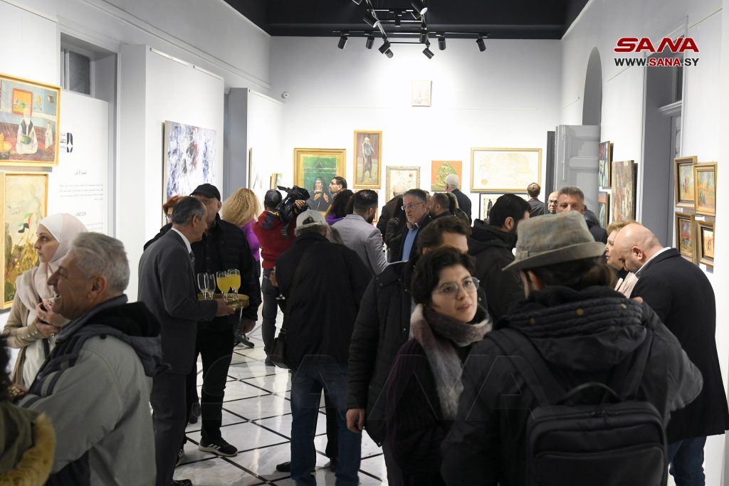 المعرض الذي تستضيفه غاليري دمشق وأعماله من مقتنياتها جاء بتوقيع 21 فناناً وفنانة من السوريين والفلسطينيين من جيل الرواد ومن أتى بعدهم وصولا إلى المعاصرين وتنوعت أعماله بين لوحات تصوير بتقنيات متنوعة وغرافيكية وبوسترات ومنحوتات بعدة خامات وبأحجام تراوحت بين الكبير والمتوسط والصغير.