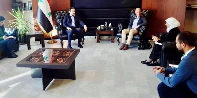 بحث وزير الشؤون الاجتماعية والعمل لؤي المنجد مع مدير قسم حماية الطفل بمنظمة الأمم المتحدة للطفولة “يونيسف” جيمس غراي سبل الاستفادة من المهارات والخبرات الموجودة لدى المنظمة في مجال بناء قدرات العاملين والدعم النفسي الاجتماعي .