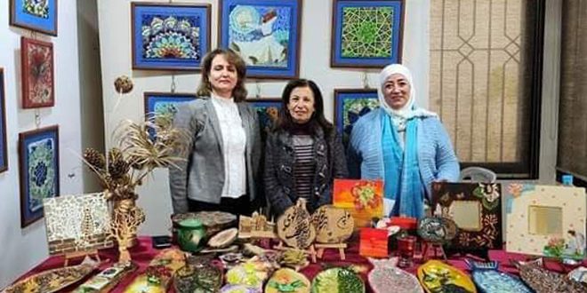 المعرض الذي يستضيفه المركز الثقافي في حي برزة بدمشق تنوعت أعماله بين المكرمية والكروشيه وإعادة التدوير للقماش ولمختلف الخامات مع الفسيفساء الزجاجي والإكسسوار والدمى القماشية.
