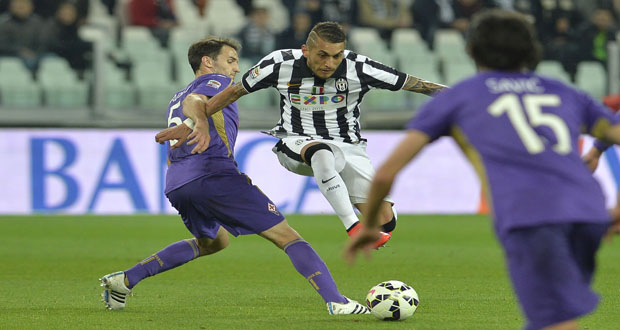 Juventus' midfielder from Argentina Roberto Pereyra (C) fights for the ball against Fiorentina's midfielder from Croatia Milan Badelj during the Italian Serie A football match between Juventus and Fiorentina on April 29, 2015 at Turin's Olympic stadium. AFP PHOTO / ANDREAS SOLARO
