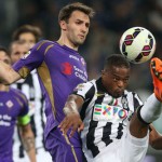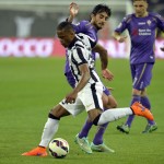 Juventus’ French midfielder Patrice Evra (R) fights for the ball with Fiorentina’s Croatian midfielder Milan Badelj during the Italian Serie A football match between Juventus and Fiorentina on April 29, 2015 at the “Juventus Stadium” in Turin. AFP PHOTO / MARCO BERTORELLO