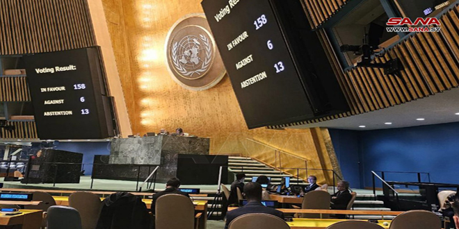 واعتمدت الجمعية العامة اليوم القرار السنوي المعنون “السيادة الدائمة للشعب الفلسطيني في الأرض الفلسطينية المحتلة، بما فيها القدس الشرقية وللسوريين في الجولان السوري المحتل على مواردهم الطبيعية” بأغلبية 158 دولة، ومعارضة خمس دول وكيان الاحتلال الإسرائيلي، في حين امتنعت 13 دولة عن التصويت.