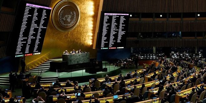 اعتمدت الجمعية العامة للأمم المتحدة اليوم قراراً بأغلبية ساحقة يؤيد حق الشعب الفلسطيني في تقرير المصير.