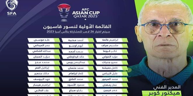 أعلن المدير الفني لمنتخب سورية لكرة القدم للرجال هيكتور كوبر قائمة منتخبنا الأولية المشاركة في بطولة كأس آسيابطولة كأس آسيا في قطر التي ستنطلق مطلع العام القادم.