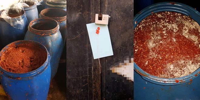 ضبط عناصر مديرية التجارة الداخلية وحماية المستهلك بريف دمشق ورشة لتصنيع مادة دبس الفليفلة في منطقة يلدا تقوم بالغش في الإنتاج، إضافة إلى وجود مواد غذائية فاسدة، حيث وجدت كمية 3.5 أطنان من هذه المادة في براميل متغيرة اللون ومتصلبة ذات رائحة كريهة، ونحو طنين آخرين من المادة تتم إعادة تصنيعها بإضافة ملون غذائي محسن لشكلها.