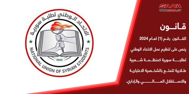 أصدر السيد الرئيس بشار الأسد القانون رقم (1) لعام 2024 الذي ينص على تنظيم عمل الاتحاد الوطني لطلبة سورية كمنظمة شعبية طلابية تتمتع بالشخصية الاعتبارية والاستقلال المالي والإداري.