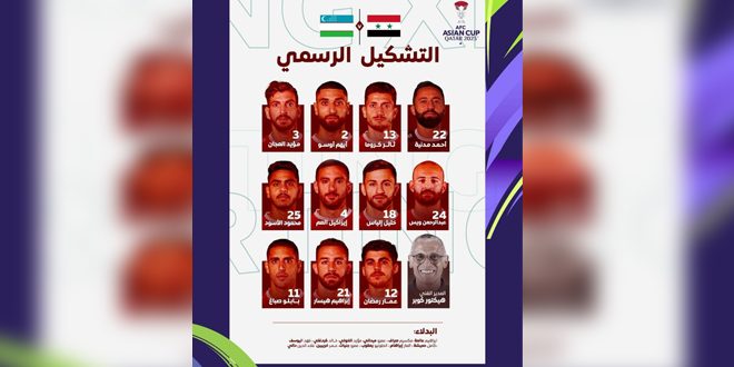 أعلن المدير الفني لمنتخب سورية لكرة القدم، هيكتور كوبر، التشكيلة التي سيخوض بها منتخبنا مباراته مع نظيره الأوزبكي اليوم، في مستهل مشواره ببطولة كأس آسيا المقامة في قطر.