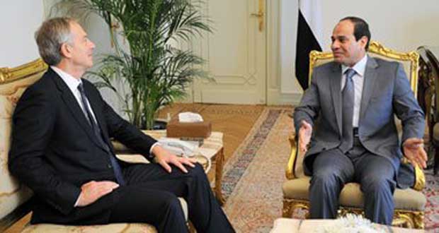 بحث الرئيس المصري عبد الفتاح السيسي اليوم مع مبعوث اللجنة الرباعية الدولية إلى الشرق الأوسط طوني بلير الموقف الحالي في الأراضي الفلسطينية المحتلة في ضوء العدوان الإسرائيلي على قطاع غزة محذرا من مخاطر هذا التصعيد العسكري وما سيسفر عنه من ضحايا من المدنيين الأبرياء.