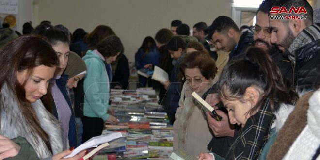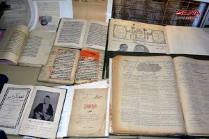 وضم المعرض الكتب المتنوعة والمخطوطات ولوحات للفن التشكيلي عن مدينة حمص.