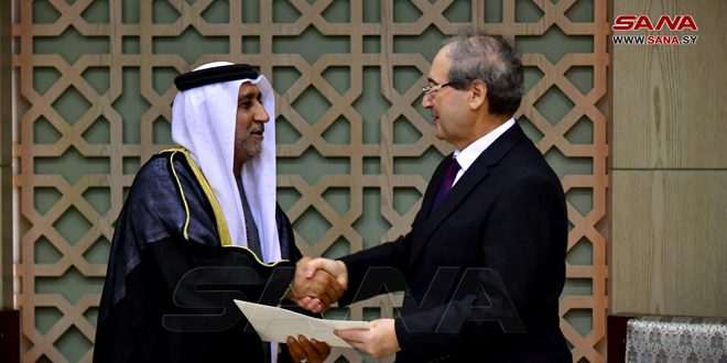 تسلم وزير الخارجية والمغتربين الدكتور فيصل المقداد اليوم نسخة من أوراق اعتماد السفير حسن أحمد الشحي سفيراً مفوضاً وفوق العادة لدولة الإمارات العربية المتحدة لدى الجمهورية العربية السورية.
