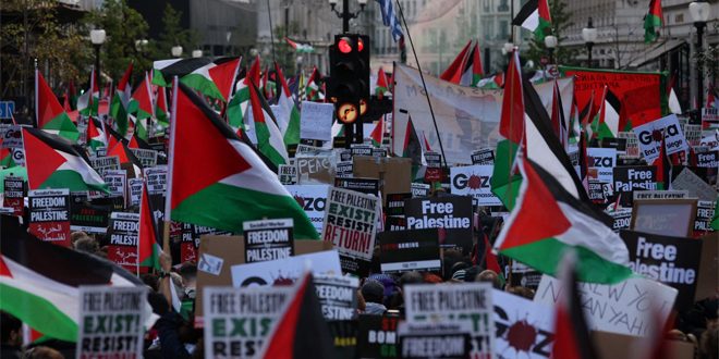 شهدت العاصمة البريطانية اليوم مظاهرة حاشدة ضمت مئات الآلاف من الأشخاص، تضامناً مع الشعب الفلسطيني وللمطالبة بوقف العدوان الإسرائيلي المستمر منذ السابع من تشرين الأول الماضي وارتكابه أعمال إبادة جماعية ضد الفلسطينيين في غزة.