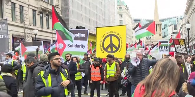 شارك عشرات الآلاف في مظاهرات حاشدة بعدة مدن وعواصم أوروبية تضامناً مع الشعب الفلسطيني الذي يتعرض لعدوان إسرائيلي وحشي وللمطالبة بوقف حرب الإبادة الجماعية التي يرتكبها كيان الاحتلال في قطاع غزة منذ 121 يوماً.