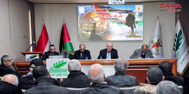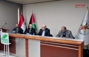 الندوة البحثية التي أقامها مركز اللغات والترجمة في حركة الجهاد الإسلامي الفلسطينية واتحاد الكتاب العرب يشارك فيها كتاب وباحثون ومفكرون ومناضلون.