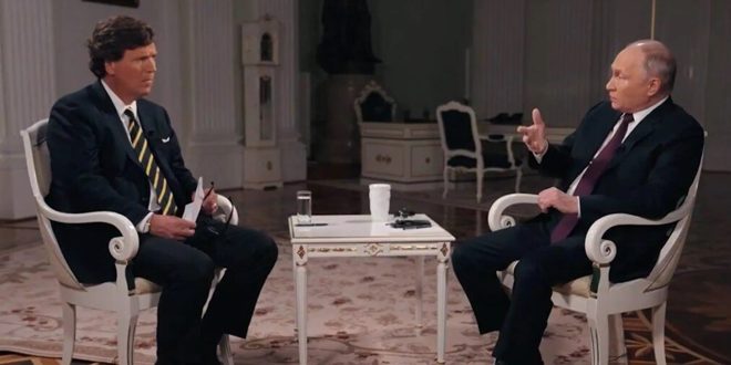 وقال بوتين في مقابلة مع الصحفي الأمريكي تاكر كارلسون نُشرت صباح اليوم: “الدول الغربية تصدر ضوضاء صارخة بشأن إلحاق هزيمة إستراتيجية بروسيا في ساحة المعركة، لكن بدأت تدرك مع طبقتها الحاكمة أن هذا ليس بالأمر السهل ولن يحدث أبداً”، مشيراً إلى “استعداد روسيا للحوار مع الغرب”.