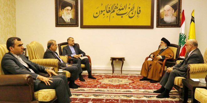 بحث الأمين العام لحزب الله السيد حسن نصر الله ووزير الخارجية الإيراني حسين أمير عبد اللهيان والوفد المرافق آخر التطورات السياسية والأمنية في المنطقة.