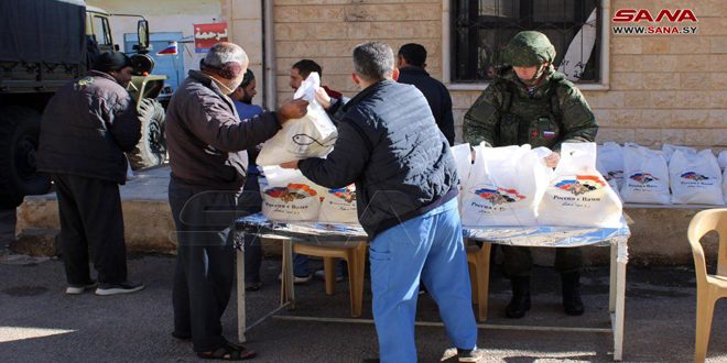 قام عسكريون روس من مركز التنسيق الروسي بتسليم مساعدات غذائية وطبية إلى أحد مشافي مدينة بصرى الشام بمحافظة درعا.