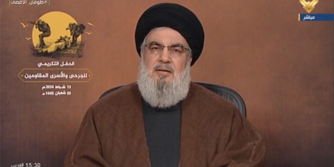 وأضاف السيد نصر الله: إن عمليات المقاومة في جنوب لبنان هدفها المشاركة والتضامن والضغط على العدو الصهيوني واستنزافه من أجل وقف عدوانه على قطاع غزة وتخفيف الضغط عن القطاع ميدانياً، مشيراً إلى أن لبنان لديه قوة رادعة، والمقاومة هي التي تستعيد الأرض وتحمي الكرامة وتعيد النازحين إلى بيوتهم وهي التي تضع حداً لأطماع الاحتلال الإسرائيلي.