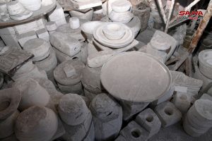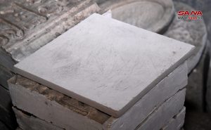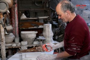 وقال في حديثه لنشرة سانا الشبابية إنه يتم عزل الحجارة وتكسيرها وطحنها حيث يؤخذ اللون الأبيض لتصنيع القطعة أما اللون الأحمر فيتم استخدامه للرسم بعد طحن الحجارة ونقعها بالماء، مبيناً أن هناك أنواعا من الحجارة لا تذوب فيصار الى إضافة القليل من الأحماض عليها وتحريكها ثم تصفيتها وتخميرها قبل أن تبدأ عملية عجنها ومن ثم تقطيعها وقصها على الناشف بحيث يتم تشكيل كل قطعة بقياسات دقيقة.