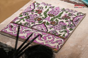 ولفت إلى أن معظم النقوش والرسومات مستمدة من الطبيعة الدمشقية بالإضافة إلى ثراء هذه الحرفة بالأشكال الهندسية، مضيفاً: “هناك أيضاً رسومات مستوحاة من الفن الإغريقي وصلتنا عن طريق الكتب وتحتاج إلى إتقان عال ودقة كبيرة لتنفيذها، حيث يضع بعض الصناع توقيعهم واسم بلدهم سورية على بعض القطع المميزة من تلك المقتنيات التي تحمل في حقائب الزوار لتروي قصص الحضارة السورية في جولاتها حول العالم.