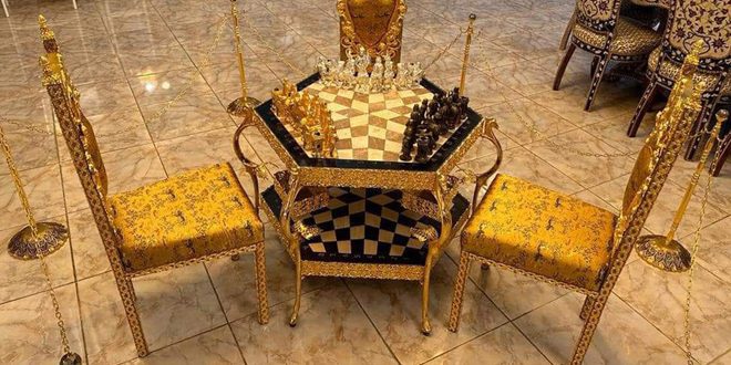 ولفت إلى أن الرقعة الأولى مصممة من الرخام البلدي، ومؤلفة من 3 لاعبين والثانية مصنوعة من خشب الجوز ومؤلفة من لاعبين مع وجود ثلاثة كراسي ملكية نحاسية منجدة بالبروكار الدمشقي بألوانه السبعة، وجميعها مشغولة بدقة وحرفية يدوية عالية.