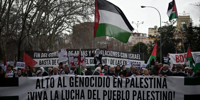تظاهر آلاف الأشخاص في العاصمة الإسبانية مدريد اليوم تضامناً مع الشعب الفلسطيني وتنديداً بالإبادة الجماعية التي يرتكبها الكيان الصهيوني بحقهم في قطاع غزة.