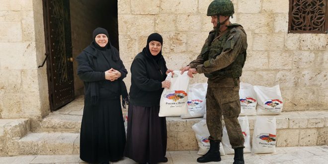 وخلال الحفل وزع العسكريون الروس عدداً من السلل الغذائية على خدام الدير، تضمنت الدقيق، والأرز، والسكر، والمعكرونة، والزيت النباتي، والشاي.