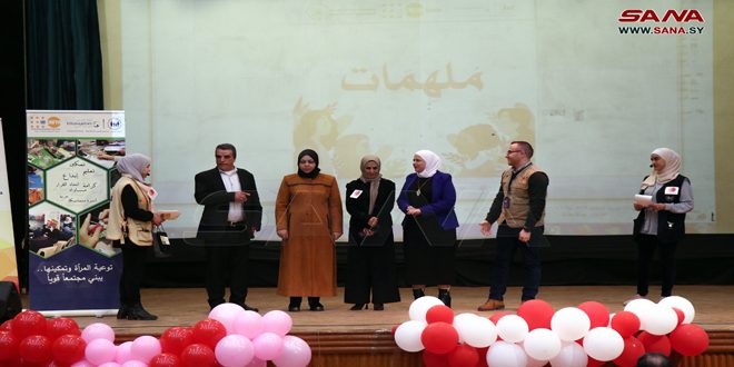 رئيستا فرع جمعية تنظيم الأسرة والجمعية السورية للتنمية الاجتماعية نجود خليل وعلا الأسعد أشارتا في كلمتين لهما إلى الخدمات المقدمة للمرأة في مجالات الصحة الإنجابية ورعاية الحوامل والدعم والتمكين في مجال التدريبات المهنية والمشاريع الصغيرة.