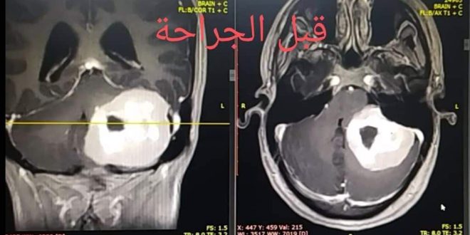 وبين مدير الهيئة العامة للمشفى الدكتور إسكندر عمار أن المريضة ذات 29 عاماً راجعت العيادة العصبية بأعراض ارتفاع توتر داخل القحف (صداع وغثيان) دون علامات بؤرية أو أذية أعصاب قحفية وبالاستقصاء الإشعاعي تبين وجود آفة شاغلة للحيز (عرطلة) على مستوى الزاوية الجسرية المخيخية اليسرى تضغط على المخيخ وجذع الدماغ بشكل شديد.