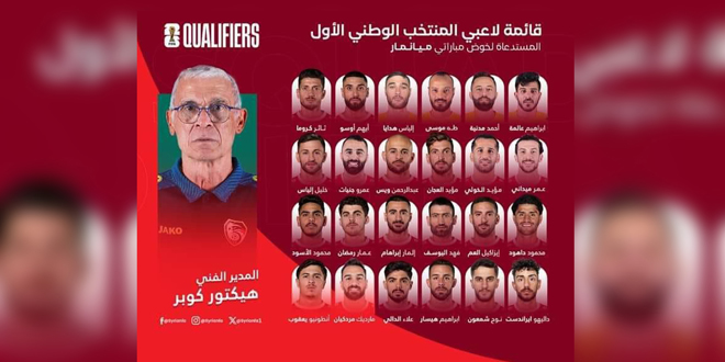 أعلن المدير الفني لمنتخب سورية لكرة القدم هيكتور كوبر قائمة لاعبي المنتخب التي ستخوض مباراتي ميانمار يومي الحادي والعشرين والسادس والعشرين من الشهر الجاري ضمن دور المجموعات في التصفيات المزدوجة لكأس العالم 2026 وكأس آسيا 2027.