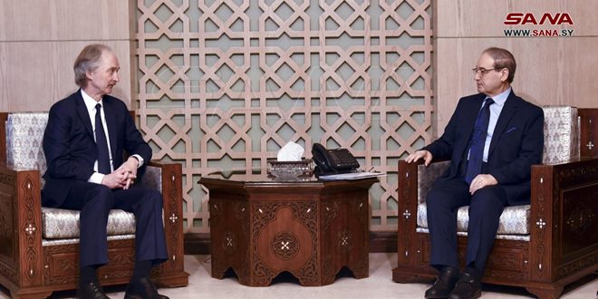 بحث الدكتور فيصل المقداد وزير الخارجية والمغتربين مع غير بيدرسون المبعوث الخاص للأمين العام للأمم المتحدة إلى سورية التعاون القائم بين سورية والأمم المتحدة والتسهيلات التي تقدمها الحكومة السورية للأمم المتحدة ومكاتبها في سورية، بما في ذلك مكتب المبعوث الخاص.