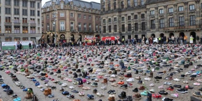 شهدت مدينة أوتريخت الهولندية عرض 14 ألف حذاء أطفال في واحد من أكبر ميادينها، وذلك إحياء لذكرى الشهداء من أطفال قطاع غزة، وللفت الأنظار إلى معاناة الأطفال جراء استمرار العدوان الإسرائيلي الوحشي.