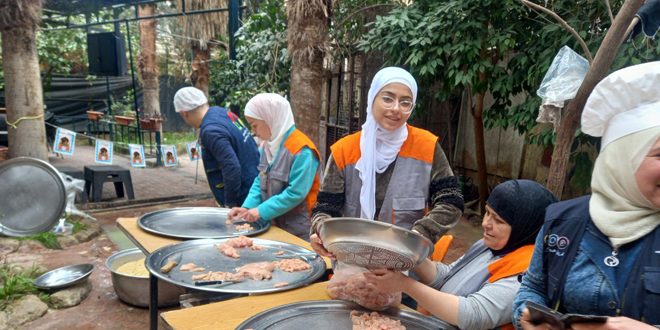 وأشارت علي إلى أن الفريق المكون من نحو 400 متطوعاً ومتطوعة يقوم على مدار اليوم بإعداد أكثر من 6000 وجبة طعام لتوزيعها على العائلات المستهدفة بالتعاون مع لجان الأحياء والمخاتير، لافتة إلى أن الفريق ينتشر في أكثر من مكان بدمشق وريفها.