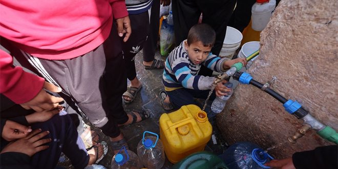 وأكد غنيم أن هذا الوضع المائي الكارثي يتطلب تحركاً عاجلاً في ظل تفاقم حالات الجفاف والمجاعة والموت المترتبة عليه وارتفاع معدلات الأمراض والأوبئة الخطيرة جراء اضطرار الفلسطينيين إلى شرب مياه مالحة وملوثة ونتيجة لتسرب المياه العادمة وتدفقها في التجمعات المأهولة ومراكز إيواء النازحين بسبب انعدام خدمات الصرف الصحي.