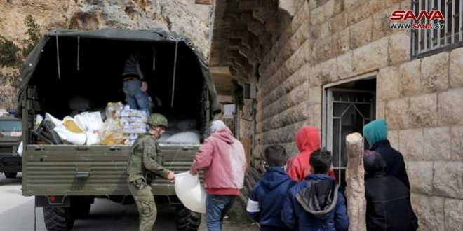 وذكرت مراسلة سانا أن اللواء راديونوف قائد القوات الروسية بدمشق ونائب رئيس مركز التنسيق الروسي بدمشق والمنطقة الجنوبية يوري بوبوف أشرفا على عمليات توزيع المساعدات التي شملت مواد غذائية “طحين وزيت ومعلبات غذائية وحليب”.
