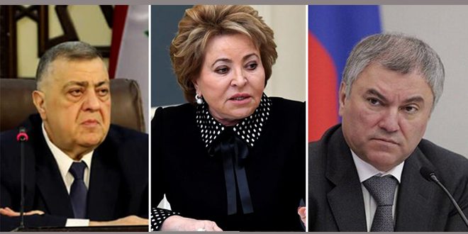 أرسل رئيس مجلس الشعب حموده صباغ رسالتي تعزية إلى رئيس مجلس الدوما الروسي فيتشيسلاف فولودين وإلى رئيسة مجلس الاتحاد للجمعية الفيدرالية لروسيا الاتحادية فالنتينا ماتفينكو عبر فيهما عن إدانة مجلس الشعب للهجوم الإرهابي الغادر والجبان الذي استهدف مجمع كروكوس التجاري في موسكو وأدى إلى سقوط عدد كبير من الضحايا والجرحى والمصابين من الأبرياء المدنيين.