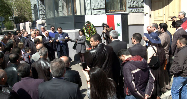 نظم الطلبة السوريون وأبناء الجالية السورية في روسيا ورابطة الدول المستقلة وقفة تضامنية بمناسبة عيد الشهداء أمام السفارة السورية في موسكو إحياء لذكرى الشهداء الذين اغتالهم العثمانيون القدامى وكذلك الذين يقدمون اليوم أرواحهم فداء لحرية الوطن وإنقاذ الشعب من غدر العثمانيين الجدد.