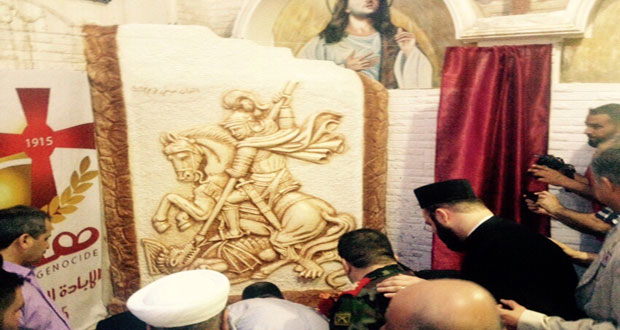 وفي نهاية الاحتفالية تمت إزاحة الستار عن النصب التذكاري للشهيد القديس مار جرجس في ساحة الكنيسة وايقاد الشموع تخليدا لأرواح شهداء سورية الأبرار.