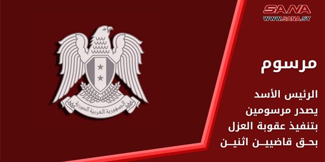 أصدر السيد الرئيس بشار الأسد مرسومين بتنفيذ عقوبة العزل التي فرضها مجلس القضاء الأعلى بحق اثنين من القضاة، وذلك على خلفية ارتكاب مخالفات وأخطاء قانونية جسيمة.