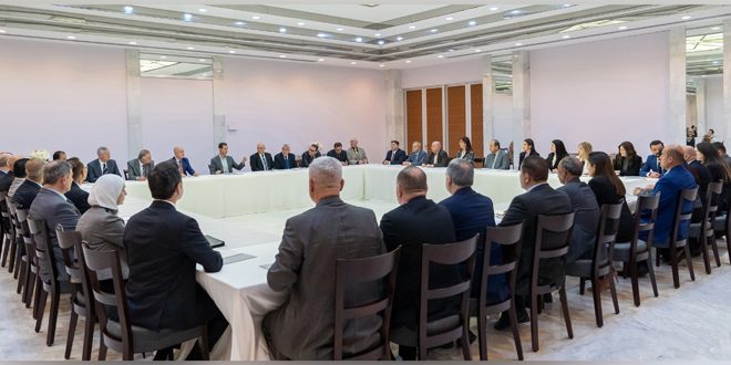 التقى السيد الرئيس بشار الأسد مجموعة من أساتذة الاقتصاد البعثيين من مختلف الجامعات الحكومية، وأكد خلال حواره معهم أن صناعة الحلول لتحدياتنا ومشاكلنا هي عملية تراكمية يؤدي الحوار فيها دوراً رئيسياً لأنه يخلق الرؤية والسياسات الصحيحة، وأن الحوار لا يمكن أن يكون منتجاً على مستوى القضايا الكبرى الاقتصادية والاجتماعية والسياسية ما لم يكن ممنهجاً وشاملاً ومستمراً على مستوى المجتمع والمؤسسات والإعلام، وبين مختلف الشرائح والقطاعات، ومدعماً بعقل علمي وعملي وأكاديمي.