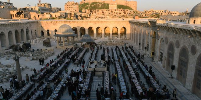 صدح أذان المغرب في الجامع الأموي الكبير بمدينة حلب معلناً عودة الحياة لهذا الإرث الديني والتاريخي بعد غياب 12 عاماً إثر تطهيره من دنس الإرهاب وذلك خلال مأدبة إفطار رمضاني جمعت 1400 من أهالي أحياء مدينة حلب القديمة والأيادي البيضاء التي تسهم في إعادة ترميم وبناء هذا المعلم الأثري.