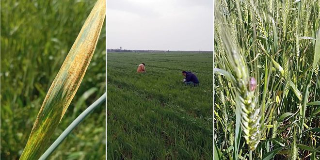 وأوضح مدير الزراعة المهندس عبد الهادي الدرويش في تصريح لسانا أنه نتيجة الجولات الميدانية لعناصر دائرة الوقاية لوحظ بعض الإصابات بمرض الصدأ الأصفر وصدأ الورقة على القمح الطري والقاسي معظمها في حقول سهل البقيعة، وتم التوجيه بمكافحتها بالمبيدات وبلغت المساحة المستهدفة 128 هكتاراً.