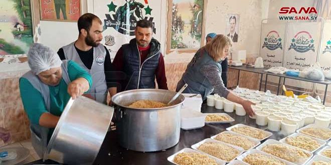 نائب رئيس مجلس إدارة الجمعية يوسف شدود أوضح في تصريح لمراسلة سانا أنه تم مع بداية الشهر الفضيل افتتاح مطبخ ميداني بعنوان “سكبة خير” لتجهيز الوجبات الرمضانية وحتى اليوم تم توزيع 850 وجبة إفطار منها 150 وجبة اليوم، إضافة لسلل غذائية، مشيراً أن الجمعية بصدد توزيع ألبسة على الأطفال من ذوي الشهداء والجرحى في ريف المحافظة الغربي بمناسبة عيد الفطر.