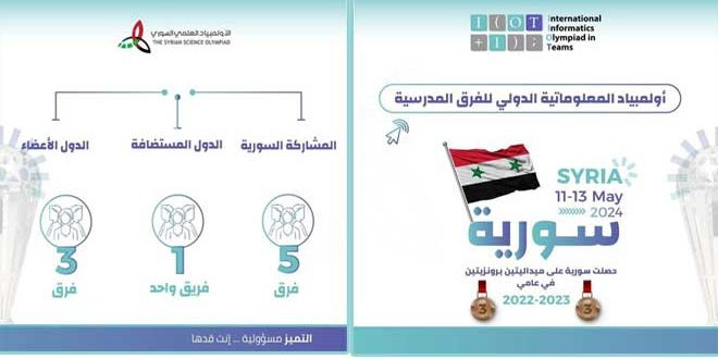 ولفتت الهيئة في بيان تلقت سانا نسخة منه اليوم إلى أن المشاركة في الأولمبياد متاحة للفرق من مختلف الدول سواء بالحضور إلى مقر البطولة أم “عن بعد” موضحة أنه يحق للدول الأعضاء المشاركة بـ 3 فرق، أما الدول المشاركة بصفة ضيف فيحق لها المشاركة بفريق واحد فقط، بينما يحق لسورية المشاركة بـ 5 فرق كونها الدولة المستضيفة للمسابقة ممن احتلوا المراكز الأولى في التصفيات النهائية المحلية التي أقيمت خلال في الـ 15 من آذار الماضي في المركز الوطني للمتميزين بحمص.