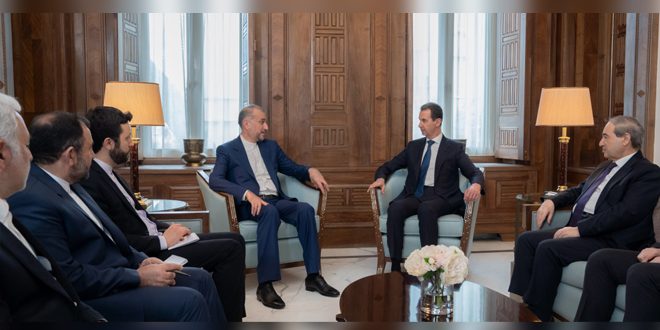 وبحث الرئيس الأسد مع عبد اللهيان سبل دعم الشعب الفلسطيني دولياً في ظل التغيرات الكبيرة في المواقف الدولية تجاه ما يحصل في غزة، كما بحث معه العلاقات الثنائية بين سورية وإيران والتنسيق المستمر بين البلدين في مختلف القضايا الثنائية والدولية.
