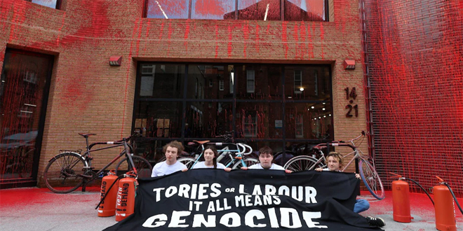 وذكرت صحيفة تلغراف البريطانية أن نشطاء منظمتي “يوث ديميند” الشبابية و”جست ستوب أويل” البيئية قاموا برش طلاء أحمر على الجزء الخارجي وردهة مبنى حزب العمال في ساوثوارك وهتفوا بأن “أيدي مسؤولي حزب العمال ملطخة بالدماء”، متهمين الحزب بالتواطؤ في قتل الفلسطينيين ودعم استمرار “إسرائيل” في الإبادة الجماعية بحق الشعب الأعزل في غزة.