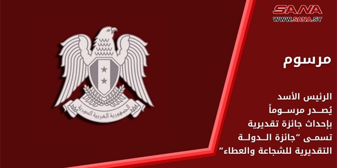 أصدر السيد الرئيس بشار الأسد مرسوماً بإحداث جائزة تقديرية تمنح للشجاعة والعطاء تقديراً وتكريماً لمن أظهر الشجاعة والبطولة والتفاني وساهم في درء المخاطر عن المواطنين أو ممتلكاتهم أو ممتلكات الدولة أو قام بعمليات الإنقاذ وتقديم المساعدة في حالات الكوارث الطبيعية.