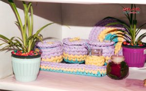 قطع متنوعة تصنعها ريم من خيط الكليم باستخدام الصنارة ومنها الحقائب والسلال ومستلزمات الأطفال وأدوات المنزل، حيث تحيك الخيطان بشكل جيد مع إدخال الإكسسوار والخشب وغيرها من المواد لتصبح جاهزة، كما أوضحت.
