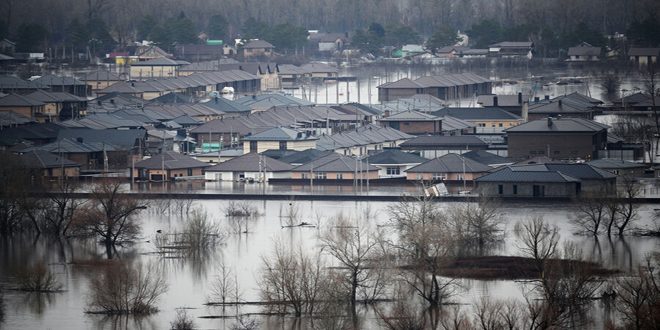 ارتفع منسوب مياه نهر الأورال في مجراه بمدينة أورينبورغ وضواحيها في جنوب روسيا إلى مستوى خطير جديد بلغ 1120 سم فوق السقف الخطر.