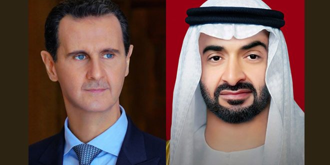 تبادل السيد الرئيس بشار الأسد وسمو الشيخ محمد بن زايد آل نهيان رئيس دولة الإمارات العربية المتحدة خلال مكالمة هاتفية التهنئة بعيد الفطر.