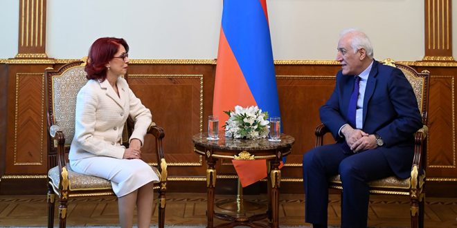 بحث رئيس جمهورية أرمينيا فاهاكن خاتشادوريان مع سفيرة سورية في أرمينيا الدكتورة نورا أريسيان العلاقات السورية الأرمينية، وأهمية العمل على تعزيز التعاون المشترك بينهما في المجالات كافة.